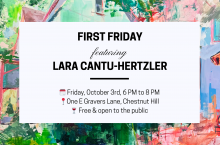 We are proud to announce that Lara Cantu-Hertzler will be our featured artist for this First Friday, October 3rd. Join us for snacks, sips, and fine art as we celebrate Lara’s contributions to the Philadelphia arts community.