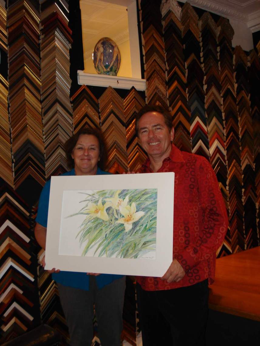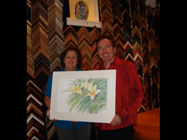 After filming the host and homeowner considering several Chestnut Hill Gallery artists' work, they decided on Susannah Hart Thomer's water color "Yellow Day" for the project. They continued to film in the framing department ultimately selecting a hand-finished frame for Thomer's piece.
